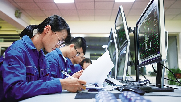 企業(yè)中控室內(nèi),技術(shù)人員正在對(duì)設(shè)備運(yùn)行情況進(jìn)行監(jiān)控。趙小麗攝