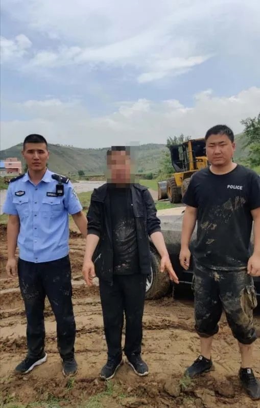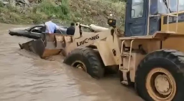 洪水還在上漲,經研判分析,洪水仍在可控范圍內,為減少損失,兩位民警再次冒著生命危險,同裝載機一同下水,用繩索系牢越野車,將被困越野車拖上岸邊。