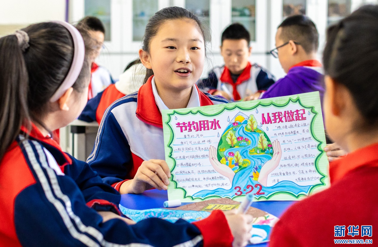 ??3月20日,呼和浩特市玉泉區(qū)石東路小學(xué)學(xué)生在繪制以“節(jié)約用水 從我做起”為主題的手抄報。新華網(wǎng)發(fā)(丁根厚 攝)
