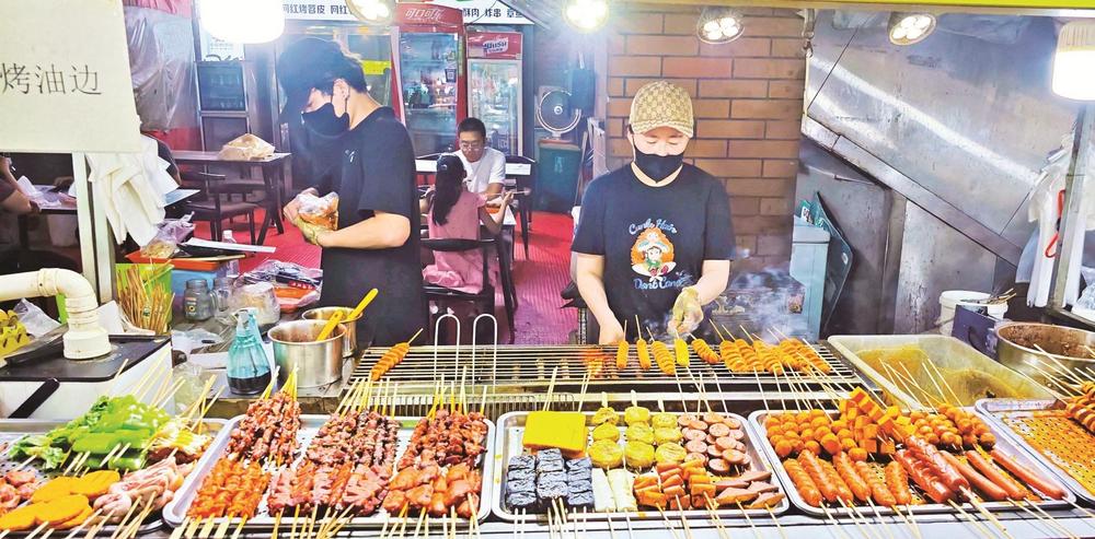 炭火上的羊肉串嗞嗞作響,油脂滴落,迸出金色火花,散發(fā)出誘人的香氣??腿藝谒芰闲∽琅裕掷锬弥?zhèn)啤酒,碰杯傳出清脆的響聲……這里沒有高檔餐廳的拘謹,只有朋友相聚的歡樂和大口吃肉的暢快。大學生徐瑞虹放暑假后,經常和朋友來夜市消暑?!拔覀儙讉€沒事就來萬達金街轉一轉,天太熱了,待在家里也悶,而且夜市里的這些小吃我們都比較喜歡,沒事幾個人喝幾瓶啤酒,聊一聊天,感覺還是很愜意的。”對于年輕人來說,夜市不僅是美食的聚集地,更是釋放壓力、享受生活的好去處。在這里,他們可以暫時拋開煩惱,盡情享受美食帶來的快樂。
