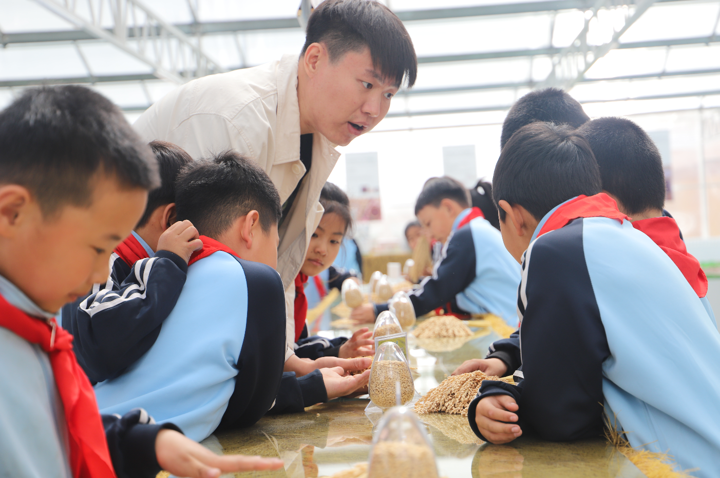 聆聽講解員老師講述大米生長過程