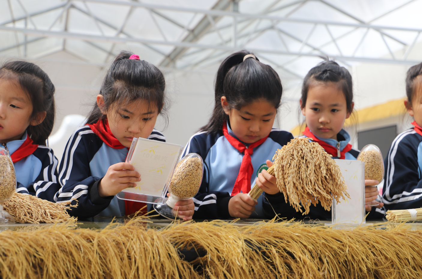來自烏蘭浩特市呼和馬場學(xué)校的孩子們,如同歡快的小鳥般簇?fù)碓谥v解員老師身旁,他們一個個全神貫注,津津有味地聆聽著一粒米從播種、抽穗到收割的奇妙旅程。這是孩子們第一次如此近距離、深入地去了解一粒米的“前世今生”,這是興安盟大米科技小院再一次迎來一批充滿好奇與求知欲的研學(xué)小客人。