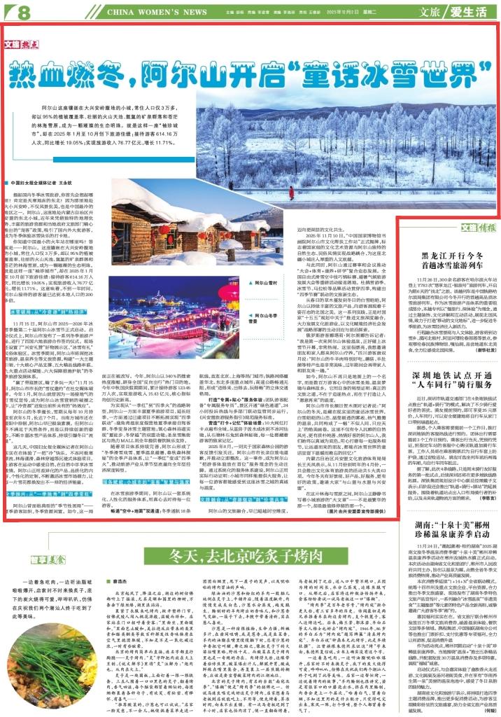 2025年12月2日,《中國婦女報》第8版刊發(fā)題為《熱血燃冬,阿爾山開啟“童話冰雪世界”》的新聞,報道了阿爾山,這座地處內(nèi)蒙古自治區(qū)興安盟的東北小城,近年來憑借獨特的地理優(yōu)勢、豐富的旅游資源和當?shù)卣穆貌块T精心推出的“寵客”政策,吸引了國內(nèi)外大批游客,成為冬季體驗冰雪快樂的打卡地。