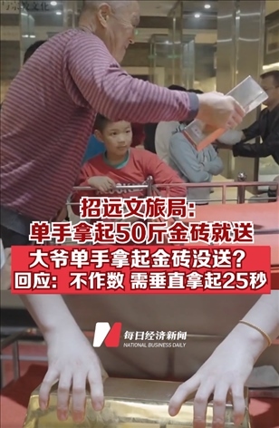 ·山東煙臺(tái)招遠(yuǎn)文旅局:?jiǎn)问帜闷?0斤金磚就送!大爺單手舉起50斤金磚沒(méi)拿走?回應(yīng):不作數(shù),需垂直拿起25秒。