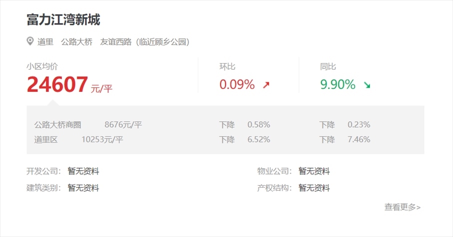 公開信息顯示,富力江灣新城地處哈爾濱道里區(qū)沿江核心地段,項(xiàng)目一期于2014年10月29日完成交房。房天下數(shù)據(jù)顯示,富力江灣新城目前二手房均價(jià)為2.46萬(wàn)元/平方米。