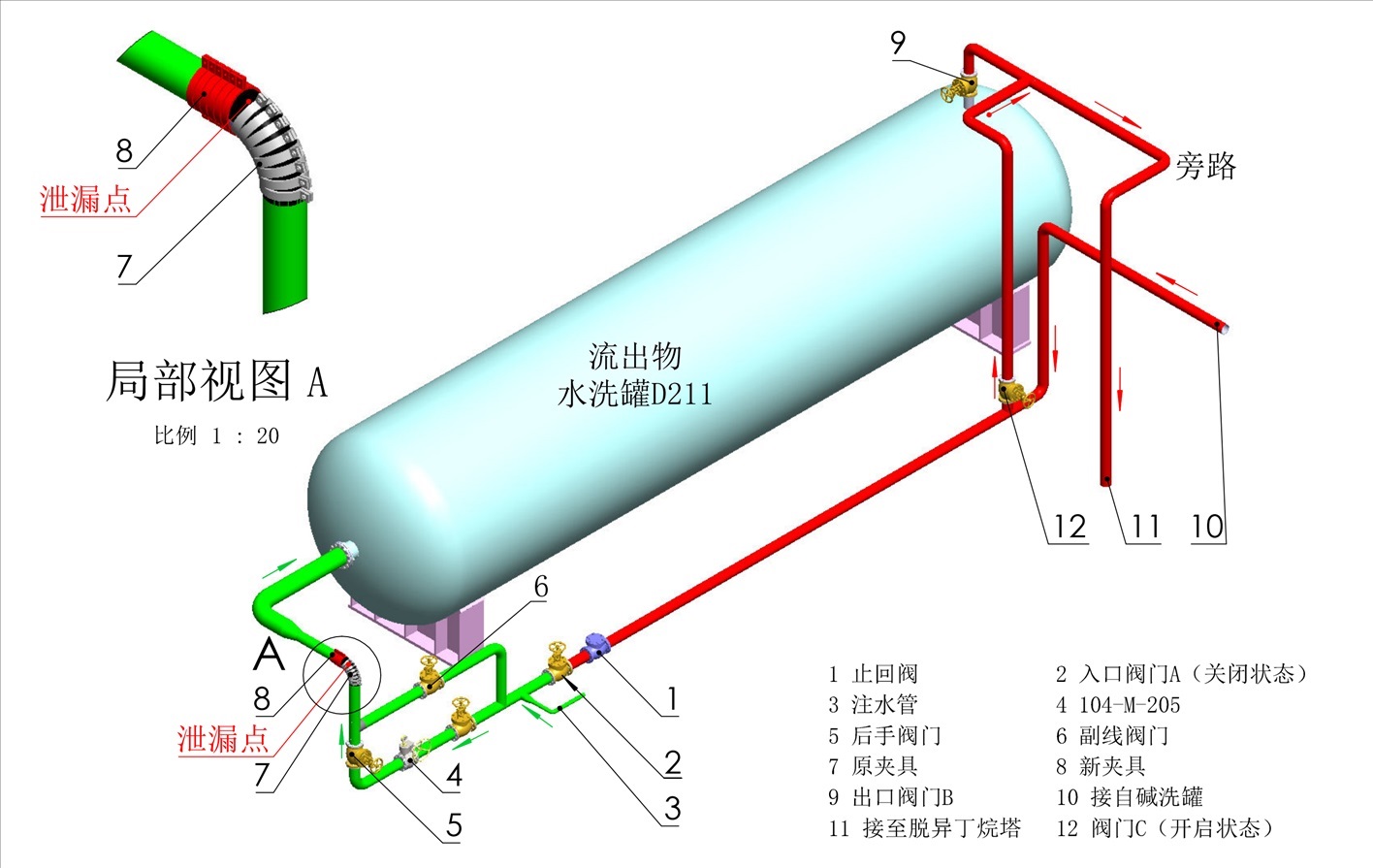 13時24分10秒,在新夾具兩側各安裝緊固1套螺栓時,原夾具水平端的管道焊縫處突然斷裂,大量介質從斷口噴出?,F(xiàn)場監(jiān)護人員立即向外疏散并安排烷基化裝置內操人員緊急停車。