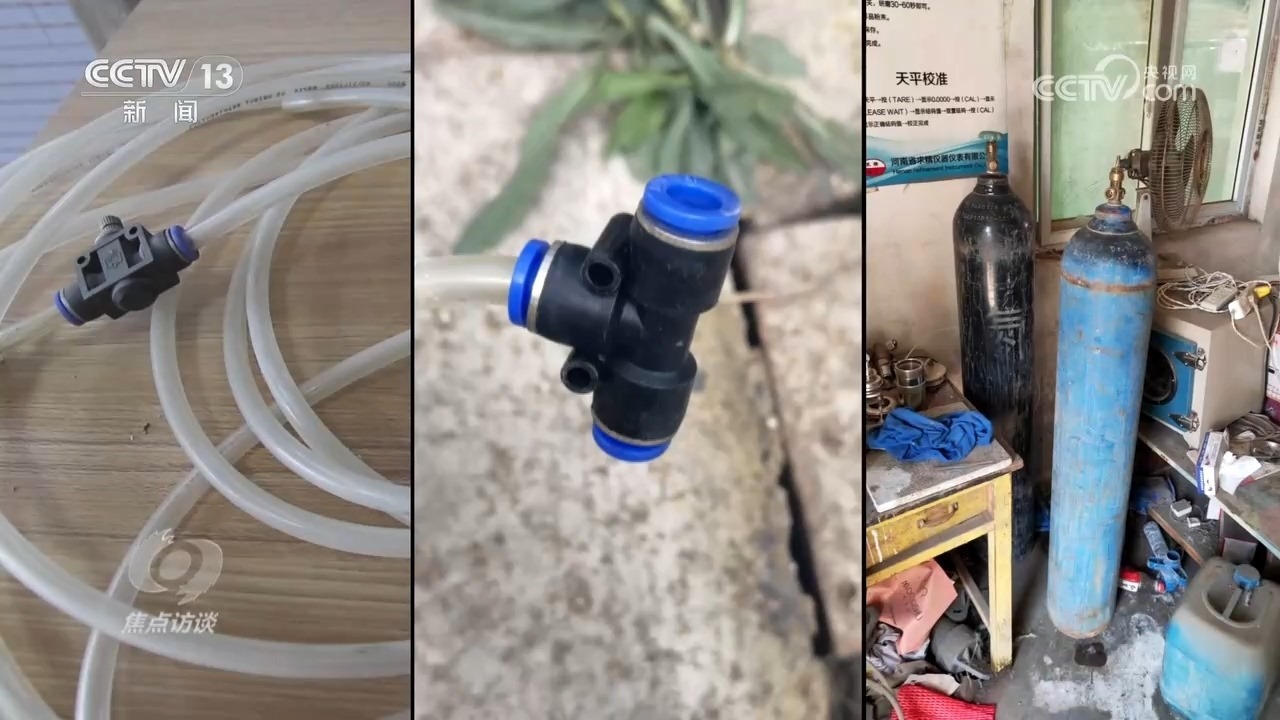 塑料軟管、三通管件、氮?dú)馄浚褪恰碍h(huán)??萍脊尽钡娜藖斫o磚廠安裝的所謂“環(huán)保設(shè)備”,他們把氮?dú)饨尤氩蓸庸芫€,稀釋采樣氣體,從而達(dá)到干擾在線監(jiān)測(cè)數(shù)據(jù)的目的。