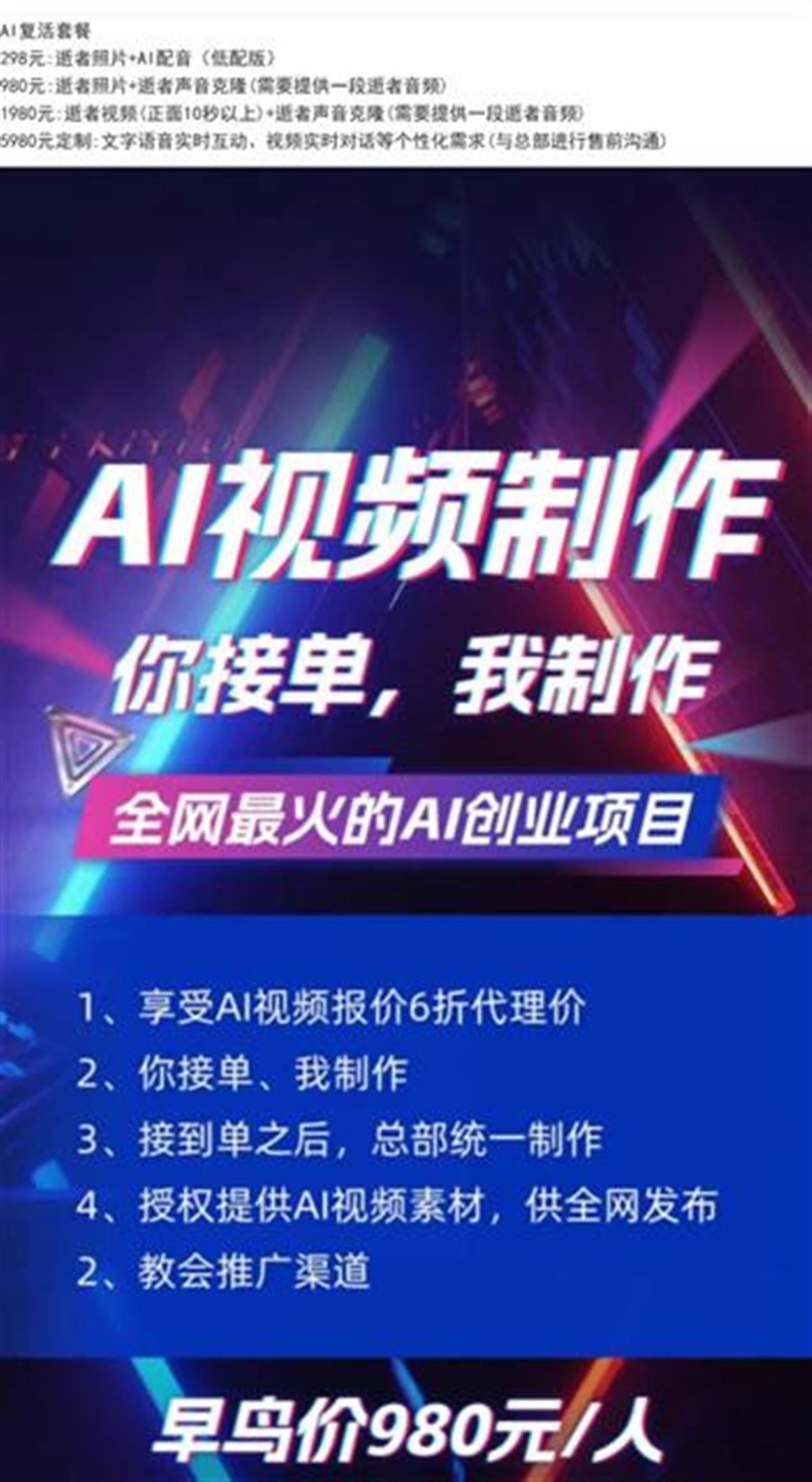 記者私信其中一名“AI復活師”詢問能否制作已逝明星的定制說話視頻,對方表示可以,且有多種模式可供選擇,需要添加微信了解詳情。對方提供的“AI復活套餐”包括“逝者照片+AI配音”“逝者照片+逝者聲音克隆”“逝者視頻+逝者聲音克隆”等服務,價格從298元到1980元不等。除AI視頻服務外,這名“AI復活師”還表示正在收徒及尋找下游代理,可提供AI視頻制作教學服務。