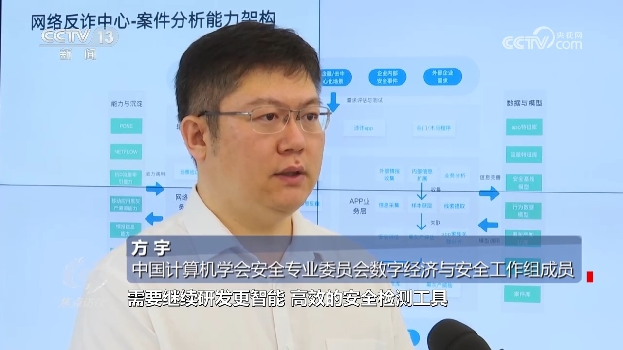 方宇:“下一步,針對涉詐APP的發(fā)現(xiàn),需要繼續(xù)研發(fā)更智能、高效的安全檢測工具,建立涉詐APP的黑名單數(shù)據(jù)庫。另外,結(jié)合一些新型、智能化的技術(shù)手段,通過對網(wǎng)絡(luò)流量分析,及時發(fā)現(xiàn)詐騙流量,并通過公安、網(wǎng)信、金融、市場監(jiān)管等部門進(jìn)一步加強聯(lián)動、信息及時共享、及時進(jìn)行阻斷,多措并舉,共同努力,形成合力,打擊涉詐APP?!?/p>