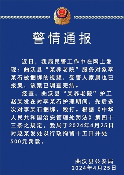經(jīng)查,曲沃縣“某養(yǎng)老院”護(hù)工趙某發(fā)在對李某石護(hù)理期間,先后多次對李某石捆綁、毆打。根據(jù)《中華人民共和國治安管理處罰法》第四十三條之規(guī)定,曲沃縣公安局于2024年4月25日對趙某發(fā)處以行政拘留十五日并處500元罰款。