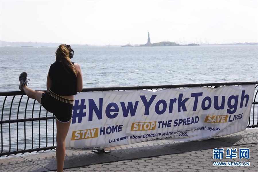 6月10日,一名女子在美國(guó)紐約一處公園內(nèi)寫(xiě)有“紐約堅(jiān)強(qiáng)”的橫幅旁鍛煉。新華社記者王迎攝