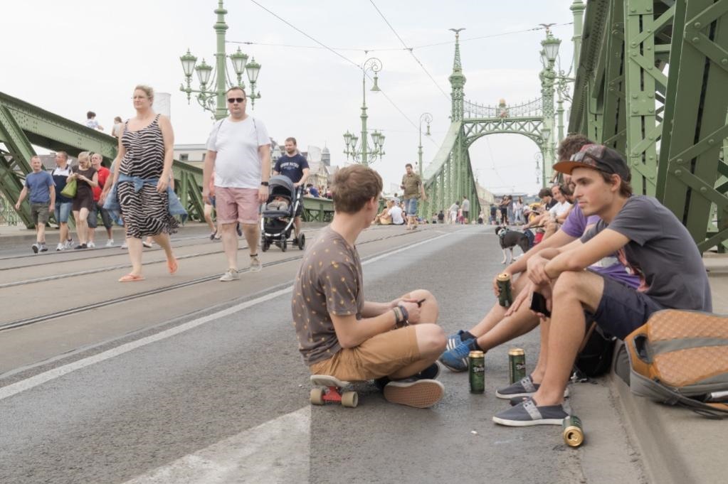 2019年7月21日,人們?cè)谛傺览锥疾歼_(dá)佩斯的自由橋上游玩。新華社發(fā)(弗爾季·奧蒂洛攝)