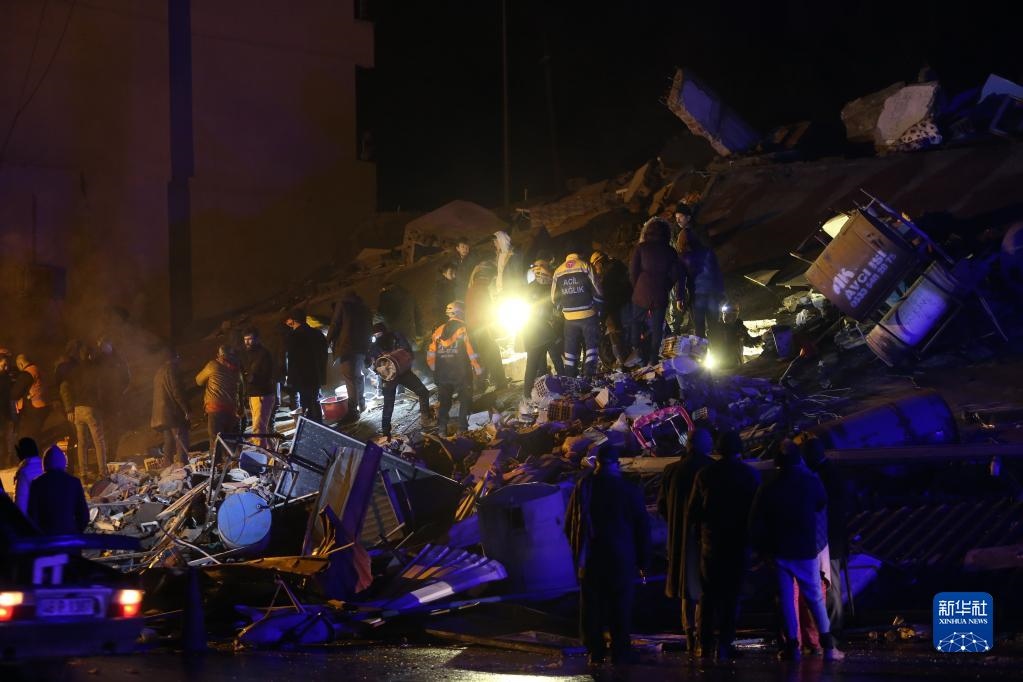 2月6日,救援人員在土耳其南部地震重災區(qū)卡赫拉曼馬拉什省帕扎爾哲克倒塌的建筑中搜尋幸存者。新華社發(fā)(穆斯塔法·卡亞攝)