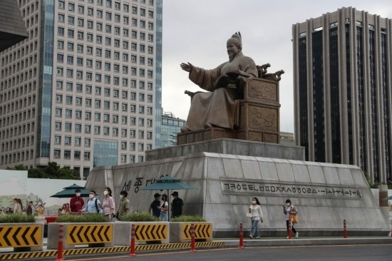 2021年7月8日,行人佩戴口罩走在韓國(guó)首爾光化門廣場(chǎng)上。(新華社記者王婧嬙攝)