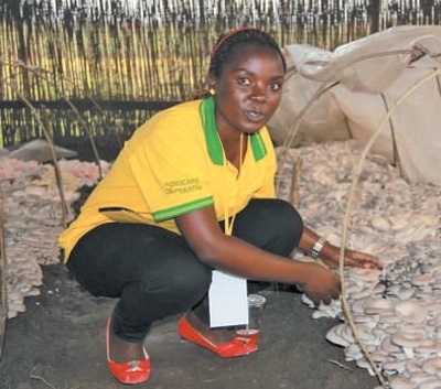 盧旺達國立大學(xué)的學(xué)生姍臺在菇棚中采收平菇。 中國國家菌草工程技術(shù)研究中心供圖