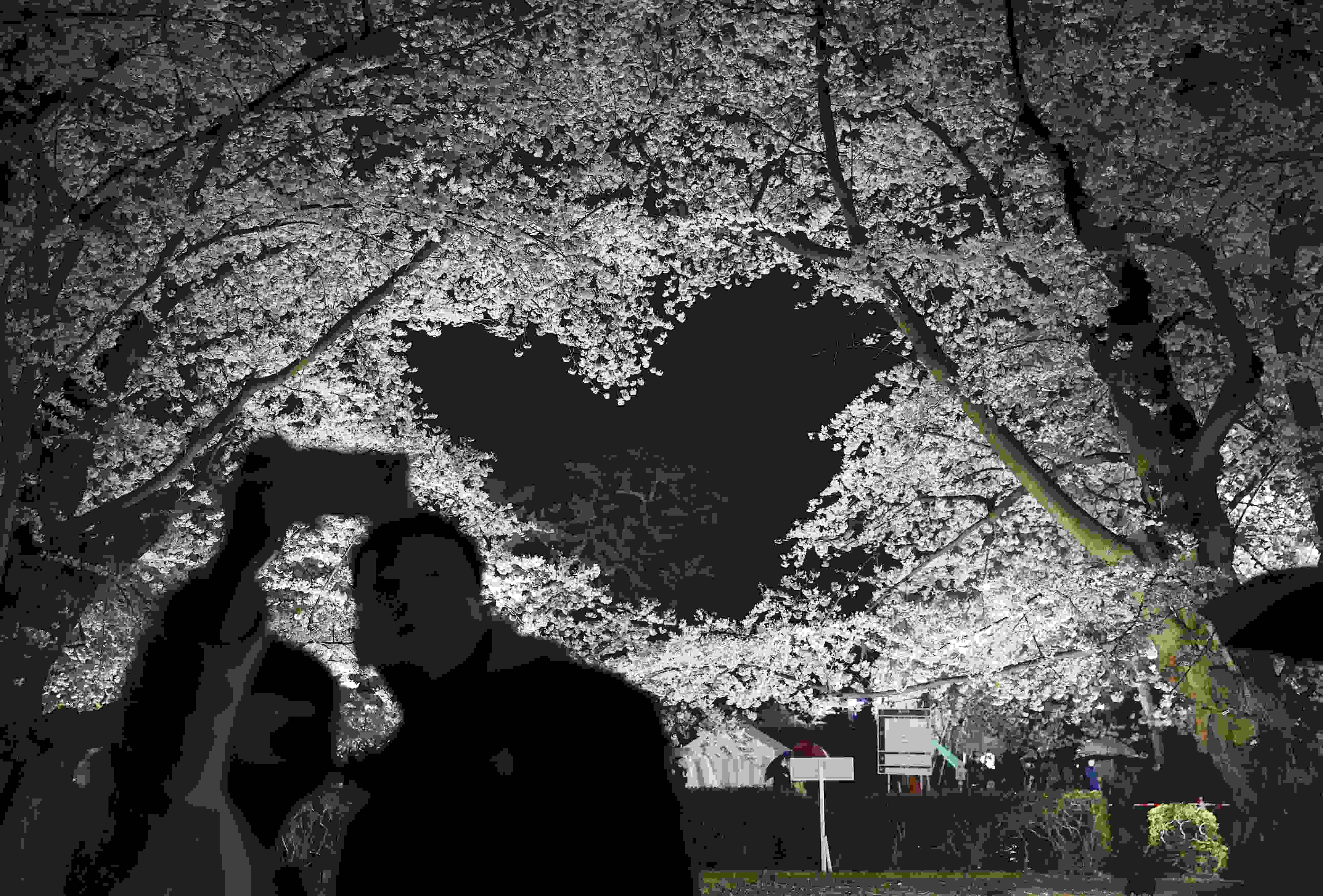 當?shù)貢r間2023年4月15日,日本青森縣弘前市弘前公園的櫻花進入盛開季。其中,有兩株盛開的櫻花樹枝相互交織,在空中形成了一個愛心形狀,成為熱門觀光景點。 視覺中國