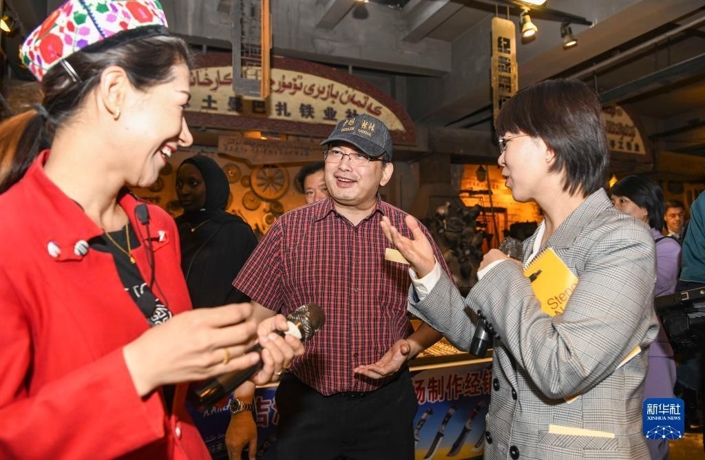 在新疆喀什古城景區(qū)鐵匠巴扎,印度尼西亞駐廣州總領(lǐng)事斌德加(中)和喀什當(dāng)?shù)貙?dǎo)游(左)聊天(4月24日攝)。新華社記者 胡虎虎 攝