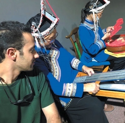 發(fā)展,是新疆留給納瓦爾的第一印象?!拔覀冏哌M了烏魯木齊這座中國西部的現(xiàn)代化城市,感受到了當(dāng)?shù)孛癖姲簿訕窐I(yè)的生活。”在新疆國際大巴扎,種類繁多的干果、色彩斑斕的艾德萊斯綢等特色產(chǎn)品讓人目不暇接?!拔矣龅搅艘晃皇炙嚲康牡靥簬煾担幙椷^程中的每一個手勢都充滿了韻律感。我陶醉于他的手藝,也被地毯精美且極具傳統(tǒng)特色的紋樣設(shè)計所吸引。我向他請教,他也熱情回答。我后來把這些美好的記憶都融入了作品當(dāng)中?!奔{瓦爾說。