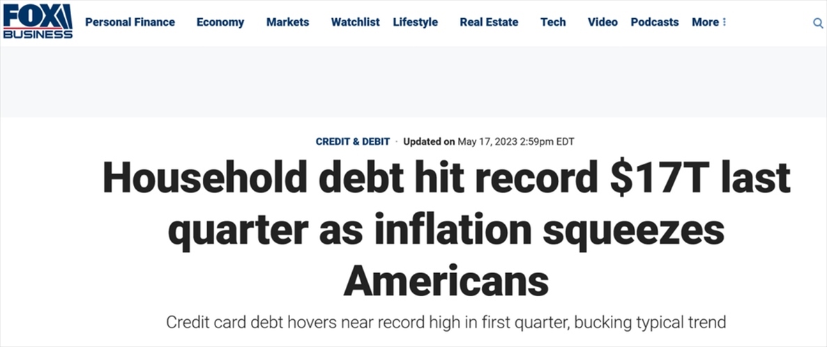 “通脹榨干了美國人,”對此,美國福克斯新聞網(wǎng)報道稱,“自2023年伊始,美國人的債臺更加高筑,有越來越多的美國家庭拖欠貸款?!?/p>