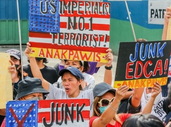 4月11日,在菲律賓首都大馬尼拉地區(qū)奎松城,民眾參加集會(huì)活動(dòng),抗議菲律賓和美國軍方舉行聯(lián)合軍事演習(xí)。新華社發(fā)(烏馬利攝)