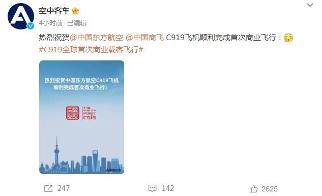 @空中客車:熱烈祝賀@中國東方航空 @中國商飛 C919飛機順利完成首次商業(yè)飛行!