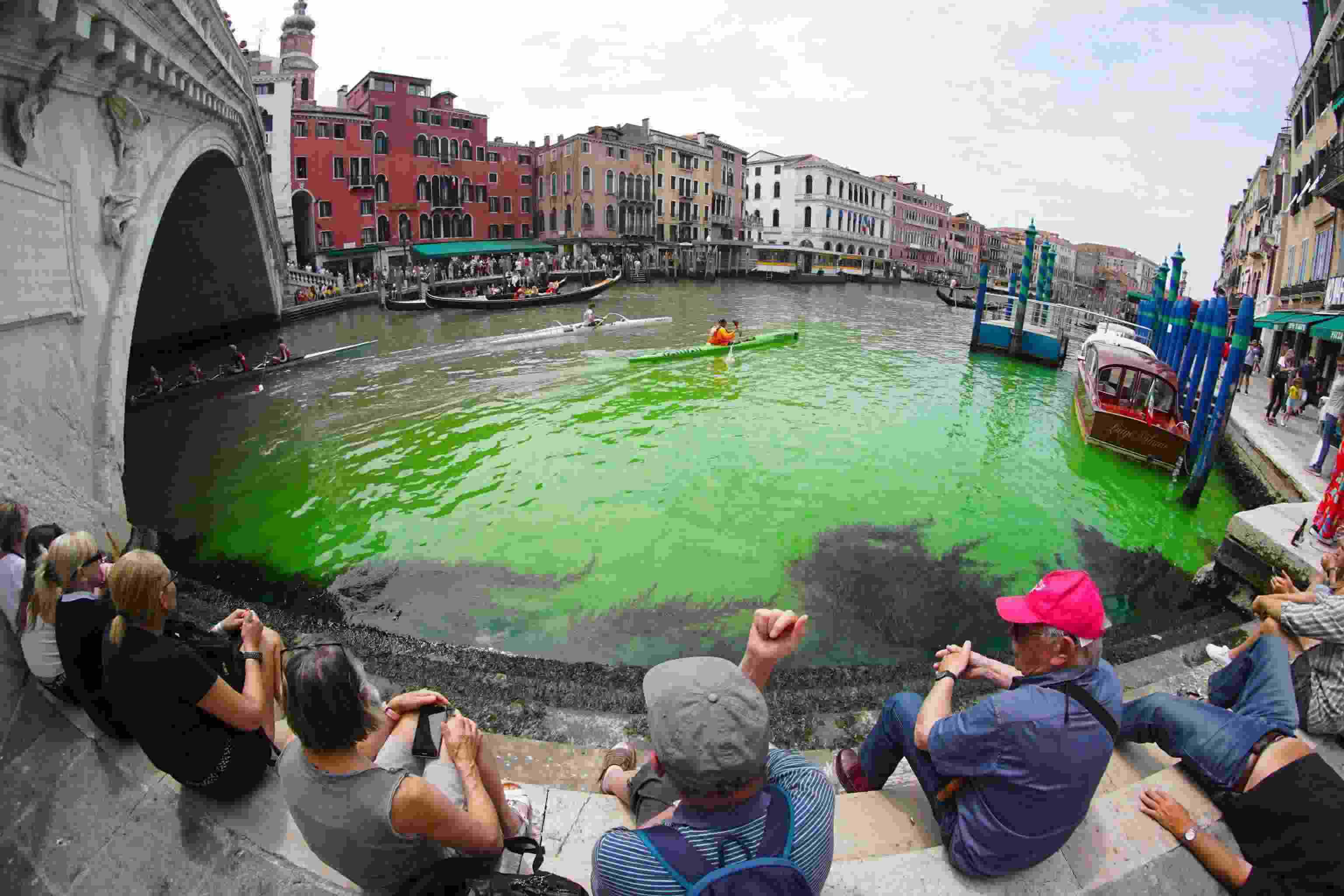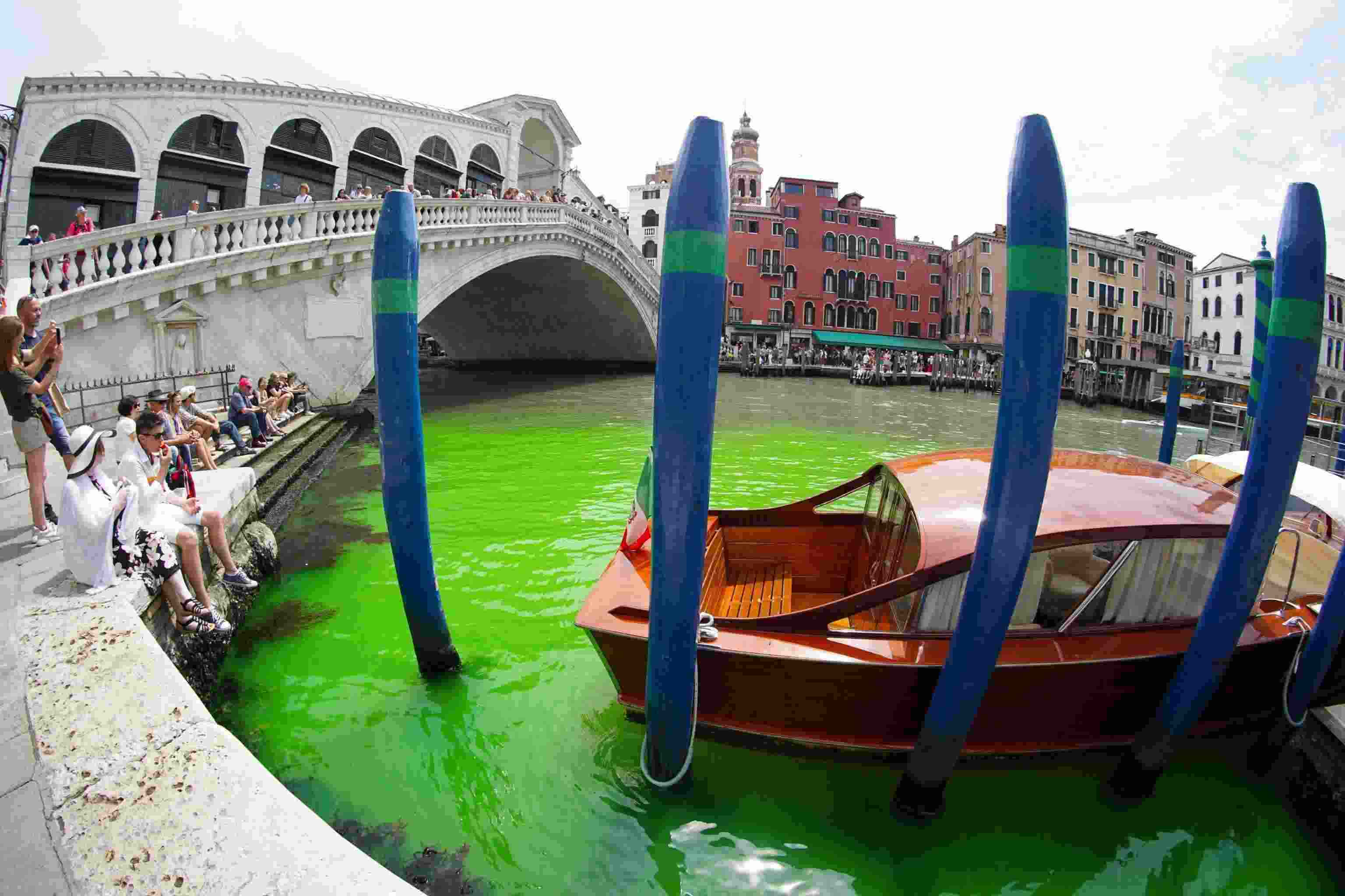 當(dāng)?shù)貢r間2023年5月28日,意大利威尼斯大運(yùn)河里亞托橋附近水域變成了熒光綠的顏色,警方等部門已經(jīng)介入調(diào)查,尋找原因。 視覺中國