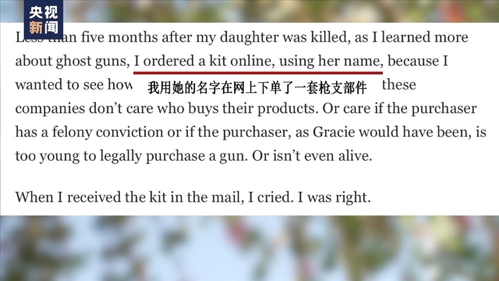 槍擊案發(fā)生不到五個月后,遇害者之一格雷斯·穆爾伯格的父親用已逝女兒的名字成功訂購到一套“幽靈槍”的槍支部件,他在《華盛頓郵報》分享了這個經歷,以此揭露“幽靈槍”行業(yè)的黑暗。