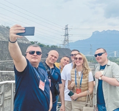 摩爾多瓦代表在宜昌市三峽船閘觀景臺(tái)上自拍。本報(bào)記者 王驍波攝