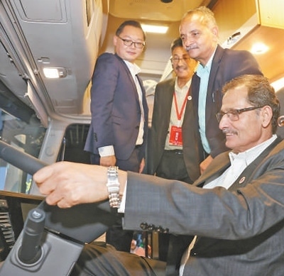 尼泊爾代表在十堰市東風(fēng)商用車品牌體驗(yàn)中心了解產(chǎn)品信息。劉 旻攝