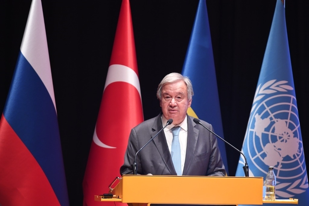 2022年8月20日,在位于土耳其伊斯坦布爾的土耳其國防大學(xué)內(nèi)的黑海糧食外運(yùn)聯(lián)合協(xié)調(diào)中心,聯(lián)合國秘書長古特雷斯出席新聞發(fā)布會。新華社記者沙達(dá)提攝