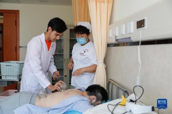 甘肅中醫(yī)藥大學(xué)針灸推拿專業(yè)的土庫曼斯坦留學(xué)生迪達(左)在甘肅中醫(yī)藥大學(xué)附屬醫(yī)院護士的指導(dǎo)下為患者進行拔罐治療(7月28日攝)。新華社記者 方欣 攝