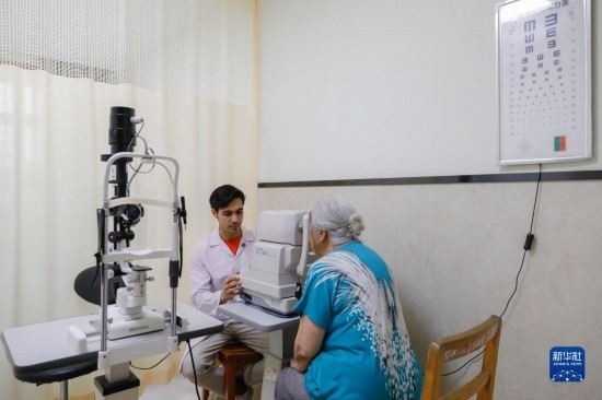 甘肅中醫(yī)藥大學(xué)針灸推拿專業(yè)的土庫曼斯坦留學(xué)生迪達(左)在臨床實習(xí)中為患者檢查眼睛(7月28日攝)。新華社記者 方欣 攝