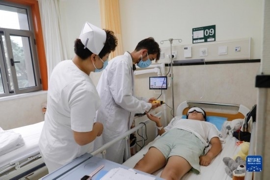 甘肅中醫(yī)藥大學(xué)針灸推拿專業(yè)的塔吉克斯坦留學(xué)生紀(jì)明哲(中)在臨床實習(xí)中為患者進行直流電離子導(dǎo)入操作(7月27日攝)。新華社記者 方欣 攝