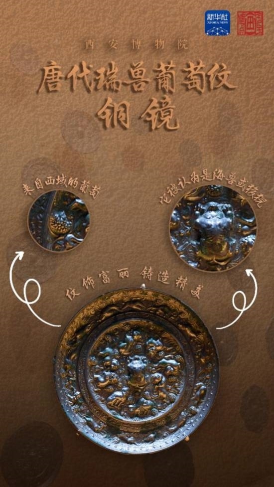在唐代,我國銅鏡制作和使用進(jìn)入繁盛時期,許多通過絲綢之路傳來的紋樣被工匠應(yīng)用在銅鏡上。瑞獸葡萄紋銅鏡紋飾富麗、鑄造精美,備受當(dāng)時民眾的青睞。瑞獸葡萄紋銅鏡將裝飾藝術(shù)和現(xiàn)實生活緊密結(jié)合,瑞獸象征著敏捷與美好,葡萄則象征著豐收充裕和多子多福,呈現(xiàn)出濃郁的盛唐氣象,是我國古代中西方文化交流的代表性產(chǎn)物。