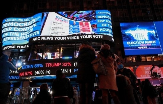 2020年11月3日,人們在美國紐約時報廣場觀看總統(tǒng)選舉實時計票結果。新華社記者王迎攝