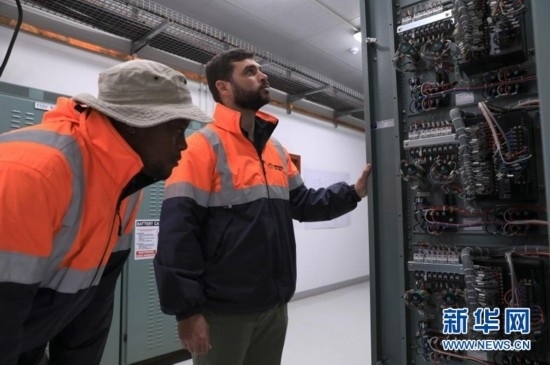 8月10日,在南非北開普省德阿鎮(zhèn),當(dāng)?shù)鼐用瘛⒆冸娬竟ぷ魅藛T達(dá)斯溫·巴松(左)與變電站副主管雷加特·范滕德在龍?jiān)茨戏枪镜掳L(fēng)電項(xiàng)目變電站工作。新華社記者 董江輝 攝