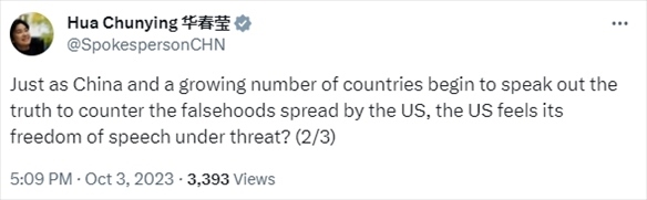 美國國務(wù)院上月28日炮制虛假報告,謊稱中國正斥資數(shù)十億美元在全球散布虛假信息。我外交部發(fā)言人華春瑩3日在X平臺對美方的謬論予以了駁斥。