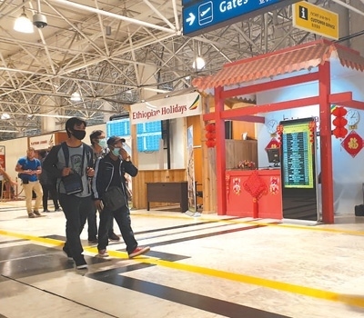 旅客經(jīng)過埃塞俄比亞博萊國際機場內(nèi)的中文服務臺。本報記者 萬 宇攝