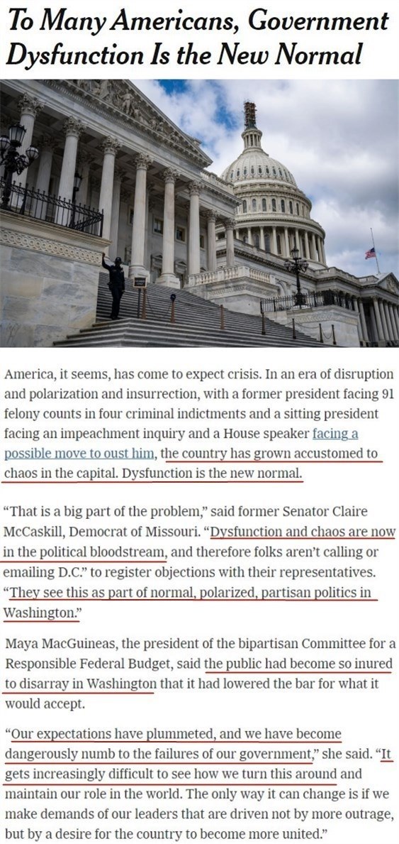 文章援引密蘇里州前民主黨籍參議員麥卡斯基爾的話說,作為華盛頓兩極分化的黨派政治的一部分,“功能失調和混亂已經融入政治血液”。