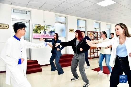 10月18日,在青島西海岸新區(qū)中醫(yī)醫(yī)院,來自山東科技大學(xué)國際交流學(xué)院的留學(xué)生在學(xué)習(xí)八段錦。