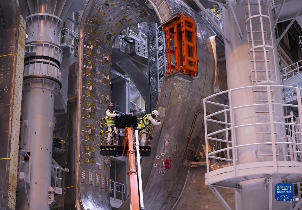 11月24日,在位于法國(guó)圣保羅-萊迪朗斯的國(guó)際熱核聚變實(shí)驗(yàn)反應(yīng)堆(ITER)預(yù)組裝大廳里,高高的吊架上懸著一個(gè)超大豌豆形金屬設(shè)備,吊斗里的技術(shù)人員正在對(duì)它進(jìn)行檢查。新華社記者 高靜 攝