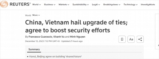 路透社12月13日?qǐng)?bào)道稱(chēng),中國(guó)和越南宣布,兩國(guó)簽署了數(shù)十項(xiàng)合作協(xié)議,同意加強(qiáng)安全事務(wù)合作,共同構(gòu)建“命運(yùn)共同體”。