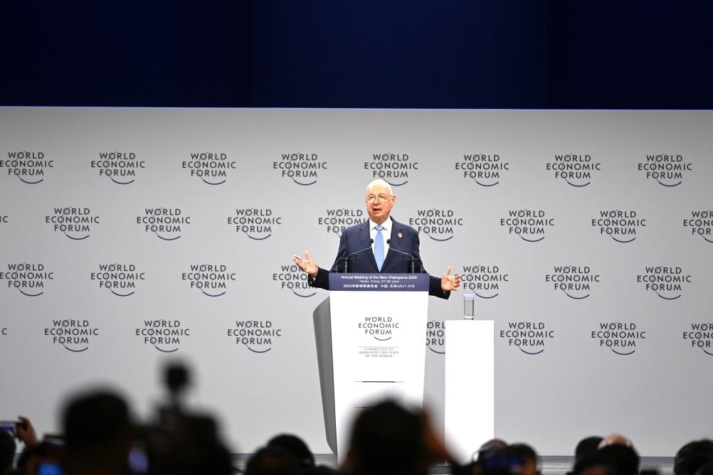 2023年6月27日,世界經(jīng)濟(jì)論壇主席施瓦布在第十四屆夏季達(dá)沃斯論壇開幕式上發(fā)言。新華社記者趙子碩攝