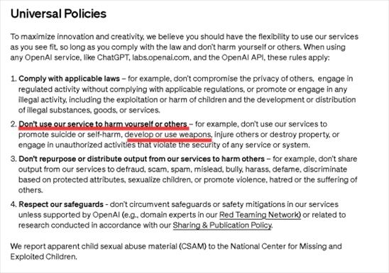 然而,在1月10日對其使用條款進(jìn)行一番大更新后,OpenAI公司雖然在禁止項(xiàng)中仍然提到禁止將其產(chǎn)品、模型和服務(wù)用于會(huì)導(dǎo)致人員傷亡的用途上,并提到了“武器開發(fā)和使用”,但先前同樣被禁止的軍事用途,如今卻在文本中消失了。