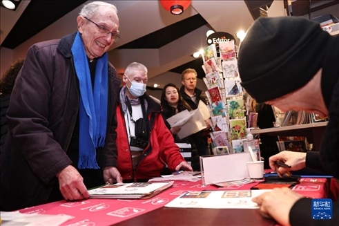 1月26日,在法國巴黎舉行的發(fā)行儀式上,郵票設計者陳江洪為當?shù)丶]愛好者簽字留念。新華社記者 高靜 攝