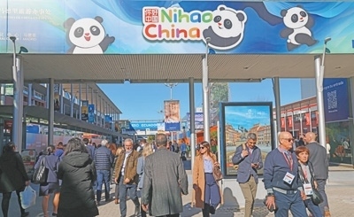會展中心外側(cè)主通道的顯著位置,印有“你好!中國”國家旅游形象圖案的廣告牌。 本報記者 許海林攝