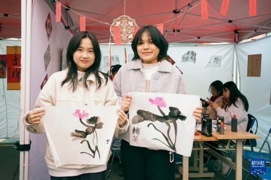 1月24日,“歡慶春節(jié)暨中越年俗文化交流體驗(yàn)”活動(dòng)在越南河內(nèi)的河內(nèi)大學(xué)舉辦,約500名學(xué)生及社會(huì)各界人士參加了書(shū)法、中國(guó)畫(huà)、剪紙、奧黛漢服秀和歌舞表演等體驗(yàn)活動(dòng),還品嘗了春卷、粽子、餃子、湯圓等傳統(tǒng)美食。這是兩名越南學(xué)生在活動(dòng)中展示自己繪制的中國(guó)畫(huà)作品。新華社記者 胡佳麗 攝