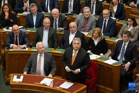 2月26日,匈牙利總理歐爾班(前右)在布達(dá)佩斯舉行的國會(huì)春季會(huì)議上致辭。新華社發(fā)(弗爾季·奧蒂洛攝)