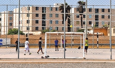 當(dāng)?shù)厍嗌倌暝陧?xiàng)目方修建的足球場(chǎng)內(nèi)踢球。
