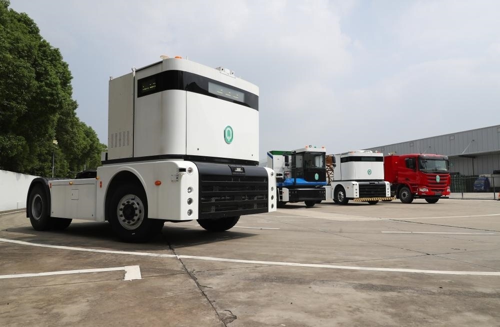 ?一輛西井科技的無人駕駛重卡Q-Truck(前)在位于上海的無人駕駛商用車聯(lián)合實驗室場地上進行動態(tài)測試(2023年9月26日攝)。 新華社記者 方喆 攝